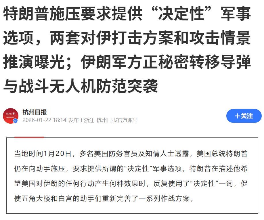 如果说之前的美伊对峙还停留在“嘴炮”和威慑阶段,那么从2026年1月21日深夜开始,一系列肉眼可见的军事异动已经将局势推向了爆发的边缘。这一次,所有的信号都指向同一个令人不安的结论:最快几天之内,一场大规模冲突可能就无法避免。