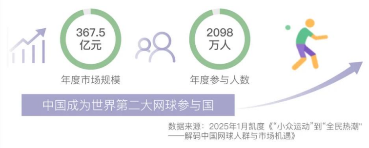 我还查到,在 2025 年的中国,已经有两千多万人在打网球。而这个数据在十年前还不到两百万。